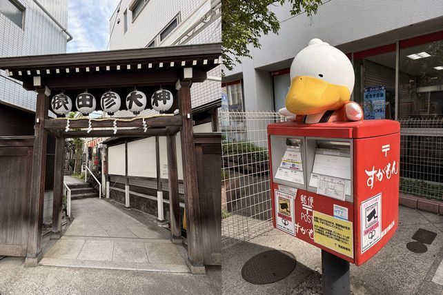 巣鴨のゆるキャラで、郵便ポストの上に乗っかっています。